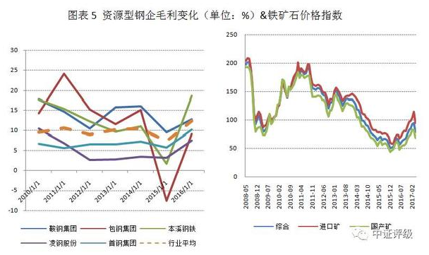 資源型鋼企的毛利率變動與鐵礦石價(jià)格的變化趨勢一致,2013年之后受全球尤其是中國鋼鐵產(chǎn)能過剩影響鐵礦石價(jià)格快速下行,資源型鋼企的毛利率進(jìn)而惡化,且惡化趨勢要顯著大于行業(yè)平均水平。2016年下半年鐵礦石價(jià)格的回暖也帶動資源型鋼企毛利的恢復(fù)。