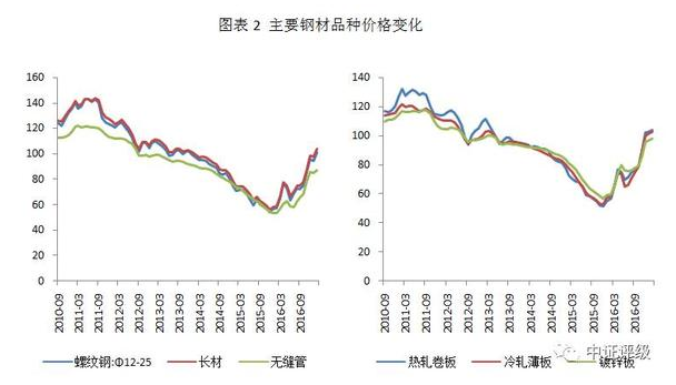 市場供需狀況的改善帶動鋼材價(jià)格的回升,螺紋鋼、長材等建筑鋼材以及板材價(jià)格在2016年二季度觸底后至今漲幅接近100%。