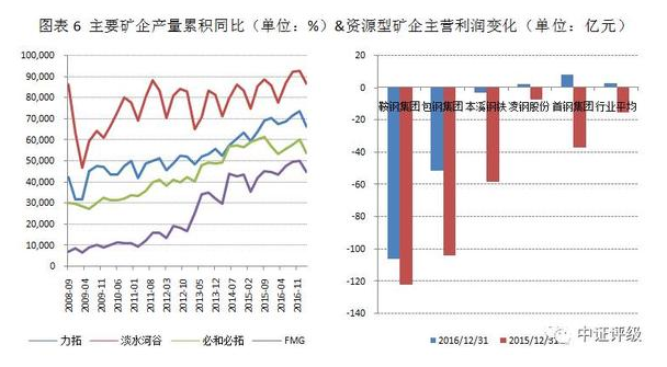但從中長期來看,資源型鋼企歷史上的相對競爭優(yōu)勢已愈發(fā)不明顯,首先隨著國外淡水河谷、必和必拓等主流礦企2013年之前新建優(yōu)質(zhì)鐵礦的持續(xù)投產(chǎn)以及隨著國內(nèi)廢鋼累積率逐步提升對鐵礦石的替代作用不斷加強(qiáng),鐵礦石市場供求將逐漸步入買方市場,國內(nèi)鐵礦石的品味和成本劣勢將越發(fā)明顯,資源型鋼企長期依賴的競爭優(yōu)勢或轉(zhuǎn)化為劣勢。從鐵礦石價(jià)格的變化趨勢可以看出,鐵礦石價(jià)格在2016年下半年持續(xù)回升,但已難以恢復(fù)到前期平均水平。本輪鋼鐵行業(yè)周期性回暖背景下,資源型鋼企盈利狀況的恢復(fù)明顯弱于行業(yè)平均。