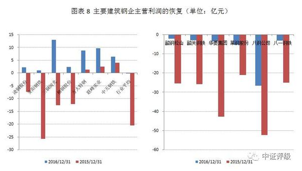 行業(yè)內(nèi)主要建筑鋼企主營利潤增幅明顯,遠(yuǎn)高于鋼鐵行業(yè)的整體平均值。但建筑鋼材市場的回暖呈現(xiàn)一定區(qū)域性分化,部分建筑鋼企2016年主營利潤仍然虧損,但相較2015年也實(shí)現(xiàn)大幅減虧。
